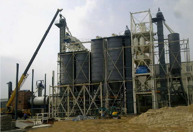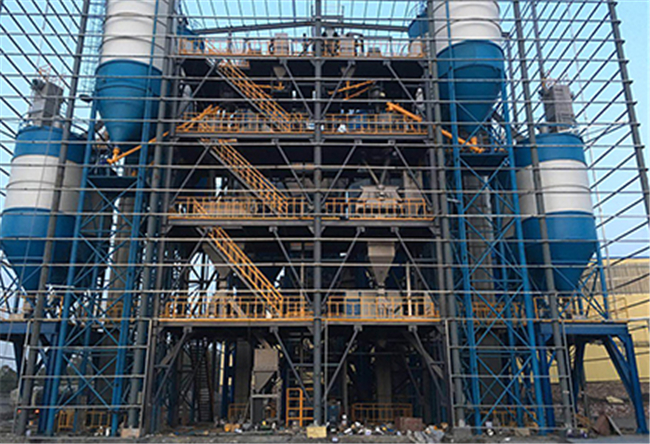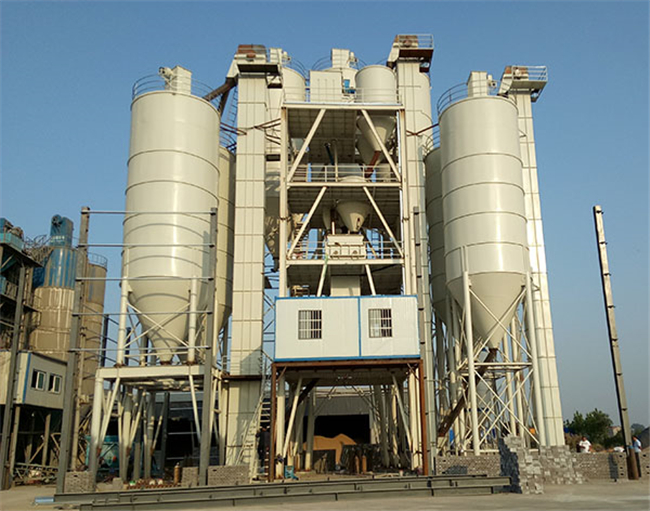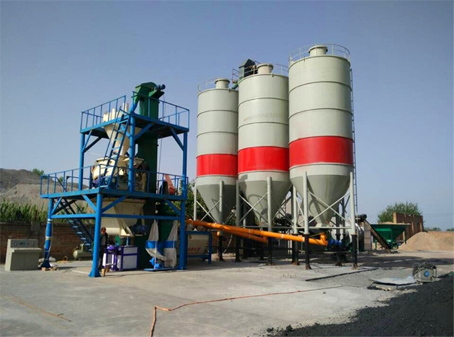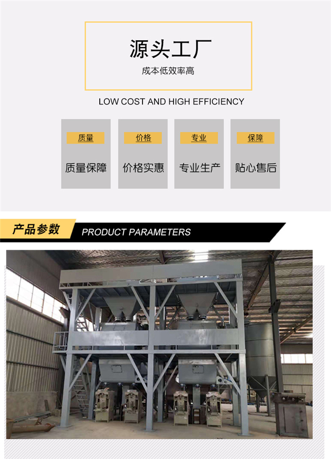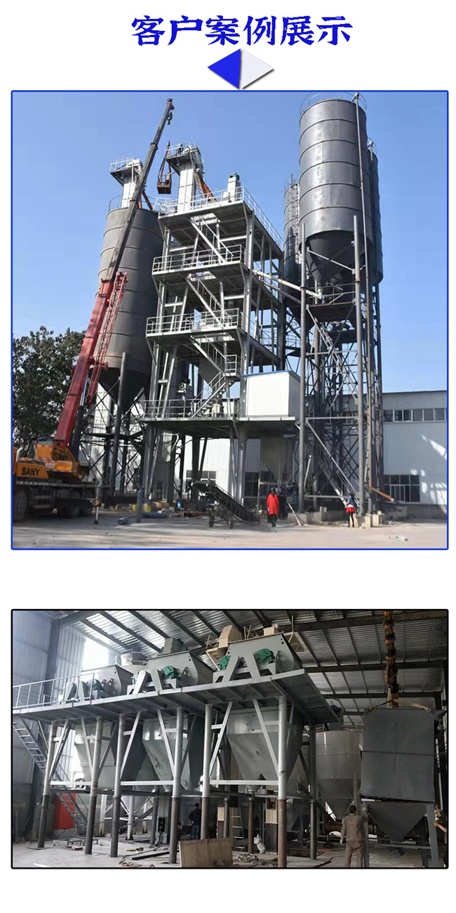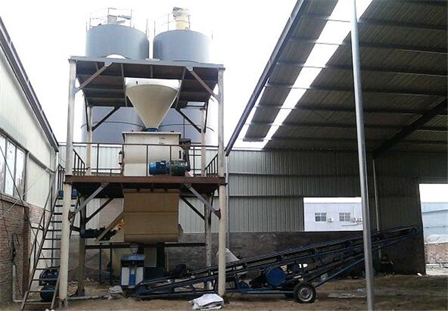 主要由提升輸送系統(tǒng)、計量配料系統(tǒng)、混合系統(tǒng)、儲料系統(tǒng)、包裝系統(tǒng)、除塵系統(tǒng)、控制系統(tǒng)、鋼架平臺等組成。