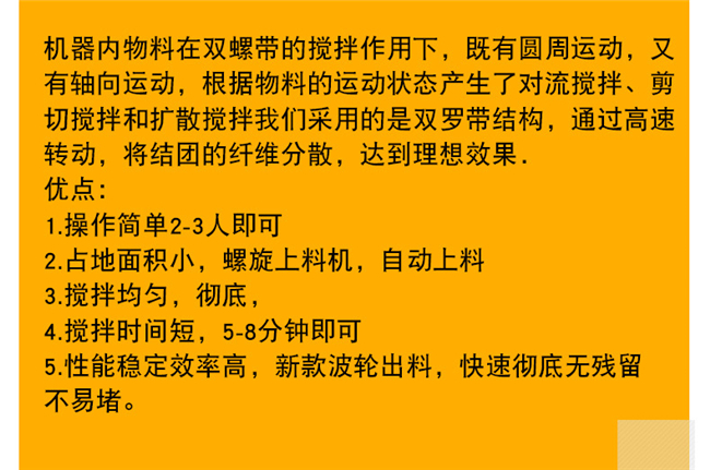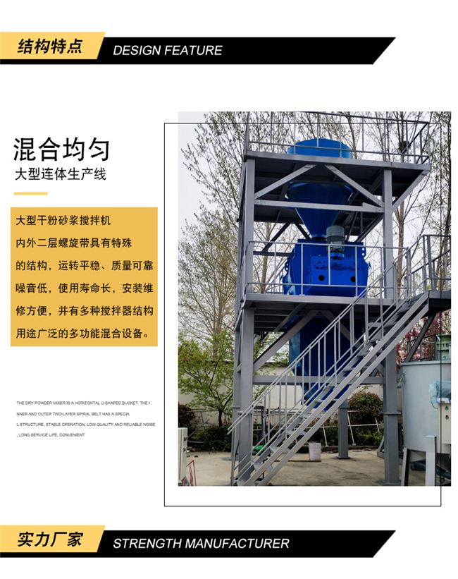 混合系統(tǒng):可配套雙軸無重力漿葉式混合機、犁刀混合機混合機,具有混合速度快、混合精度高等優(yōu)點,該機可攪拌1:10,00甚至更高的極限混合比。在攪拌漿葉合理的推動速度下,使聚苯顆粒、膠凝材料和化學添加劑等比重、粒度差異較大的物料,處于瞬間失重狀態(tài),在拌筒內形成全方位對流、擴散和相互剪切,快速溫和地達到混合均勻的效果,不會產生偏析和破壞物料的原始狀態(tài),確保了砂漿的保溫系數(shù)不會因保溫原料的形狀破壞而降低,確保了產品的保溫效果。